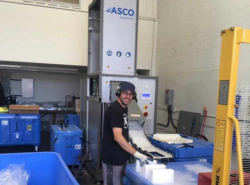 To keep up with growing demand, a Canadian dry ice manufacturer raised its production capacity with the addition of a dry ice machine from ASCO. It can produce up to 400 kilograms of dry ice per hour in the form of slices or pellets. While setting up the machine and during the start-up phase, the Swiss ASCO team provided support to the Canadian customer via remote maintenance.