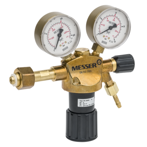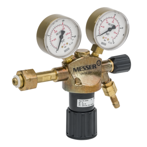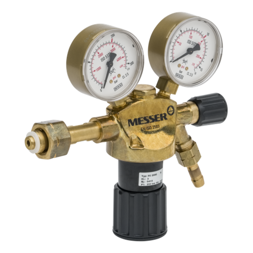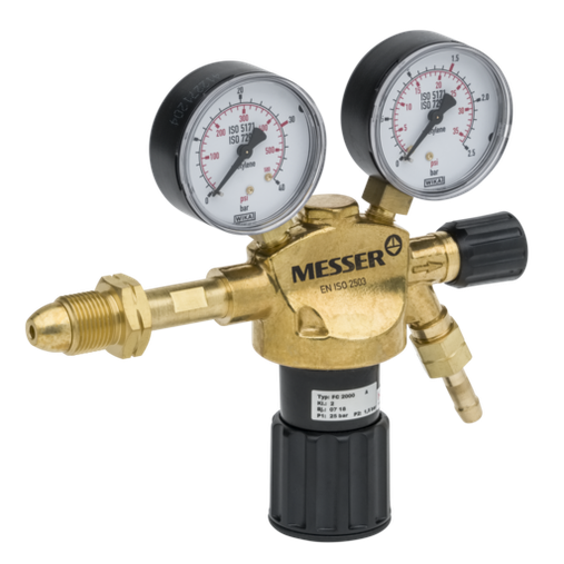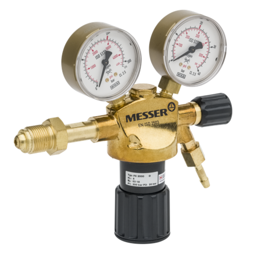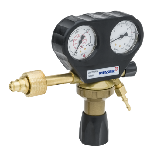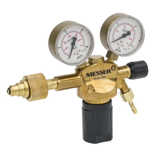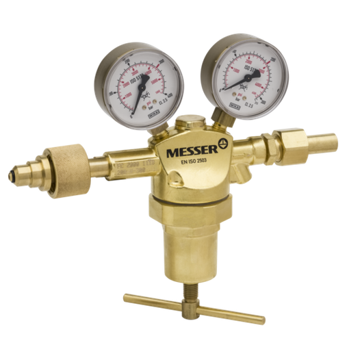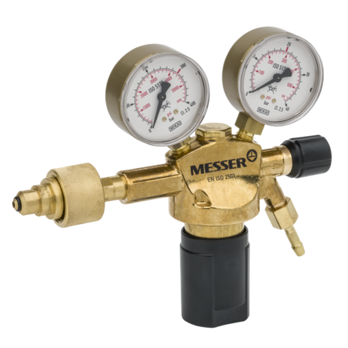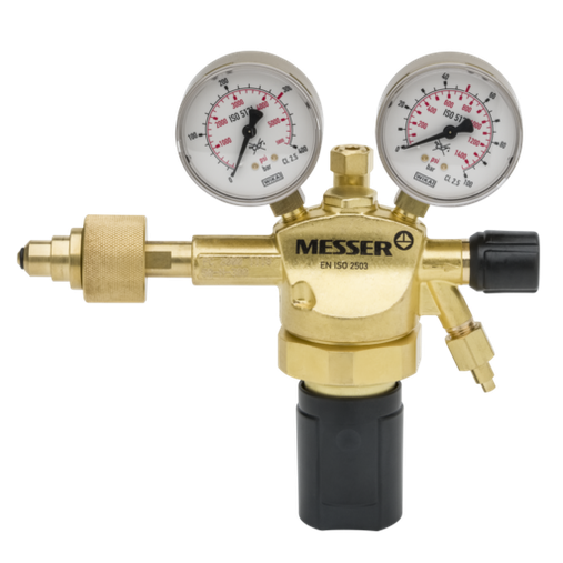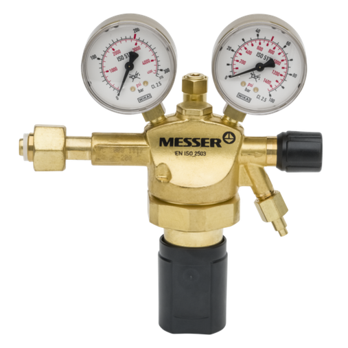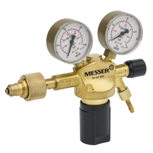 Regulador Messer para gases industriales inertes (Nitrógeno, Argón, Dióxido de Carbono), para botellas de 200 bar (conexión Tipo C normativa española), presión de salida regulable de 0-10 bar