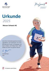 Seit vielen Jahren unterstützt Messer Schweiz den Verband PluSport Behindertensport Schweiz. Auch für 2025 hat Messer Schweiz als Spender eine Urkunde für die Förderung des Behindertensports in der Schweiz erhalten.